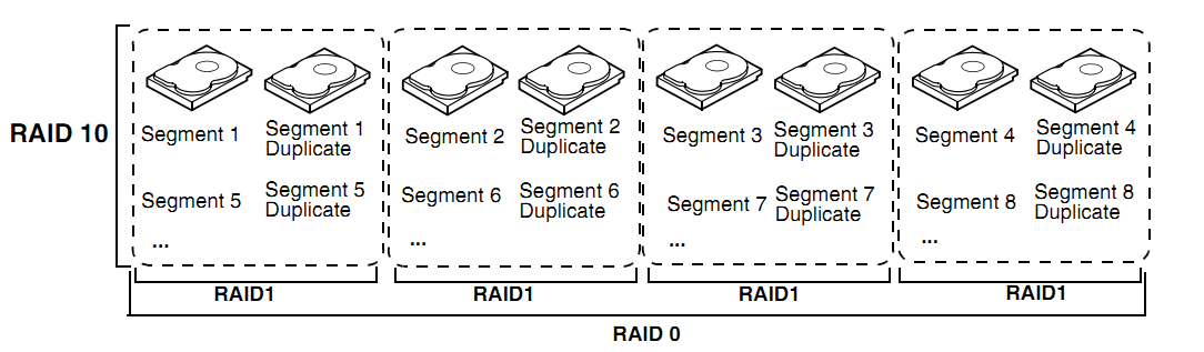 磁盘0和1做镜像后在成为条带1,再和后面的其他条带共同组成raid 10阵列。