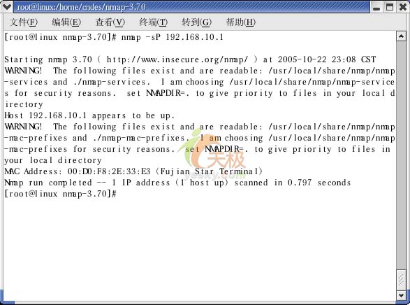 Nmap的语法很简单,但功能十分强大。比如:Ping-scan命令就是“-sP”,在确定了目标主机和网络之后,即可进行扫描。如果以root来运>行Nmap,Nmap的功能会更加增强,因为超级用户可以创建便于Nmap利用的定制数据包。使用Nmap进行单机扫描或是整个网络的扫描很简单,只>要将带有“/mask”的目标地址指定给Nmap即可。另外,Nmap允许使用各类指定的网络地址,比如192.168.100.*,是对所选子网下的主机进行扫>描。