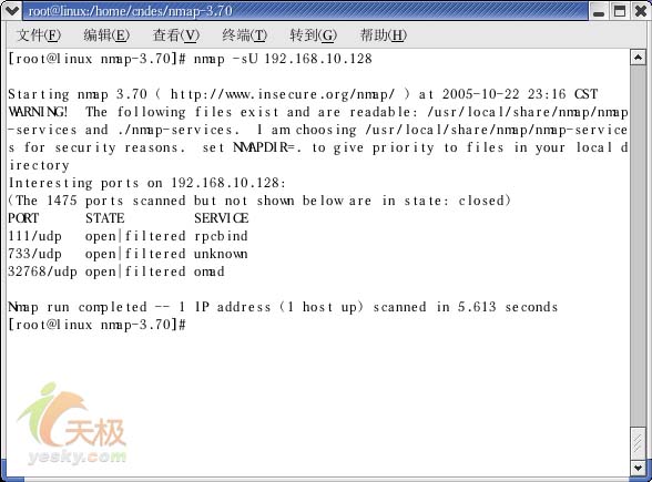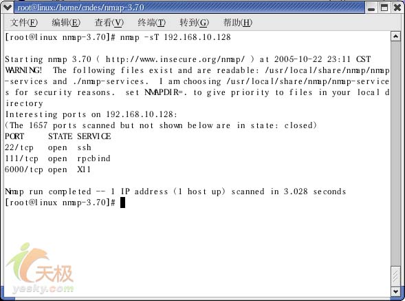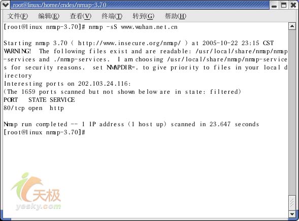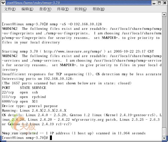Ident扫描。攻击者都喜欢寻找一台对于某些进程存在漏洞的电脑,比如一个以root运行的WEB服务器。如果目标机运行了identd,攻击者>就可以通过“-I”选项的TCP连接发现哪个用户拥有http守护进程。我们以扫描一个Linux